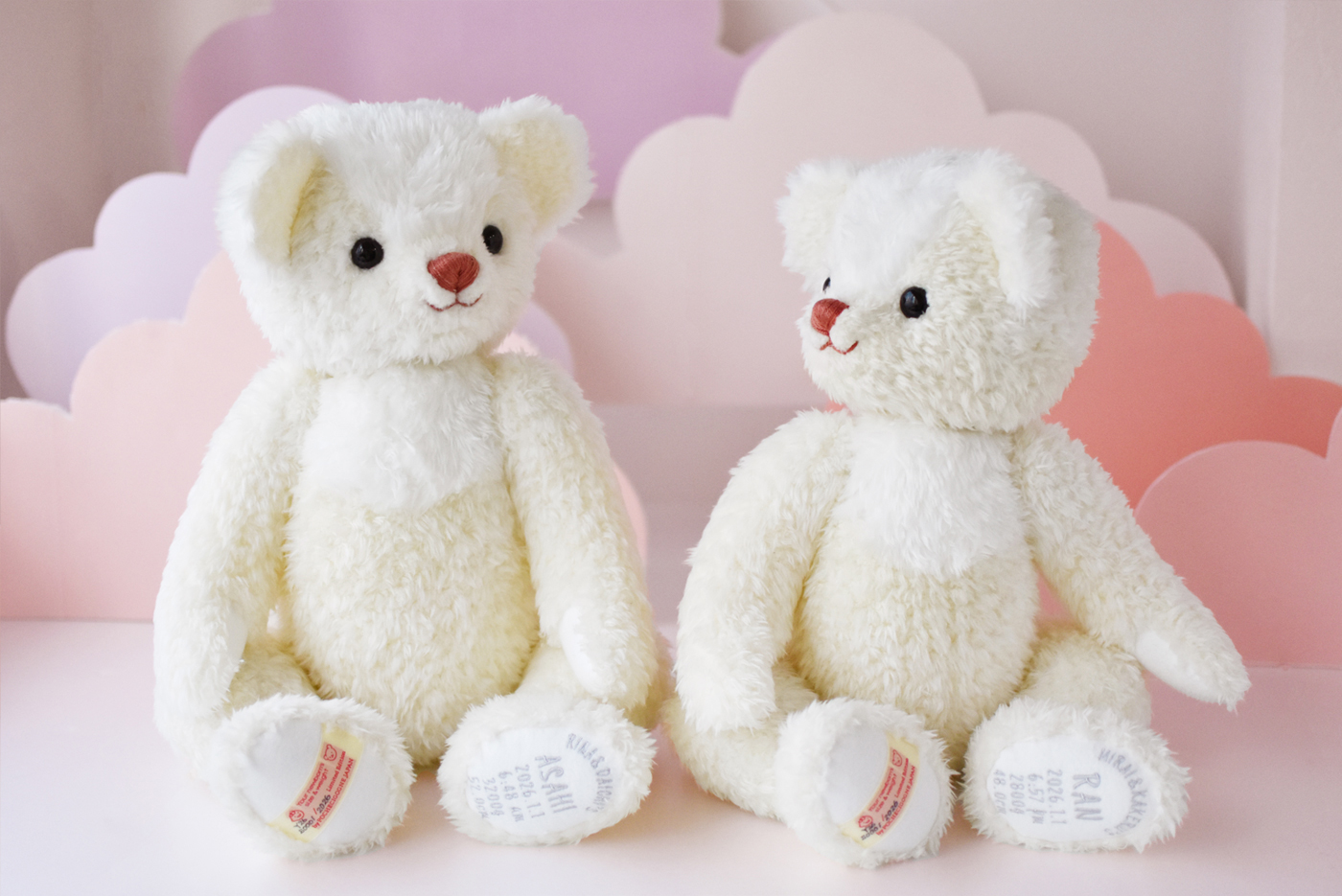 今回のベアには、ホワイト系でありながら表情の異なる、2種のオリジナル生地を使用しています。